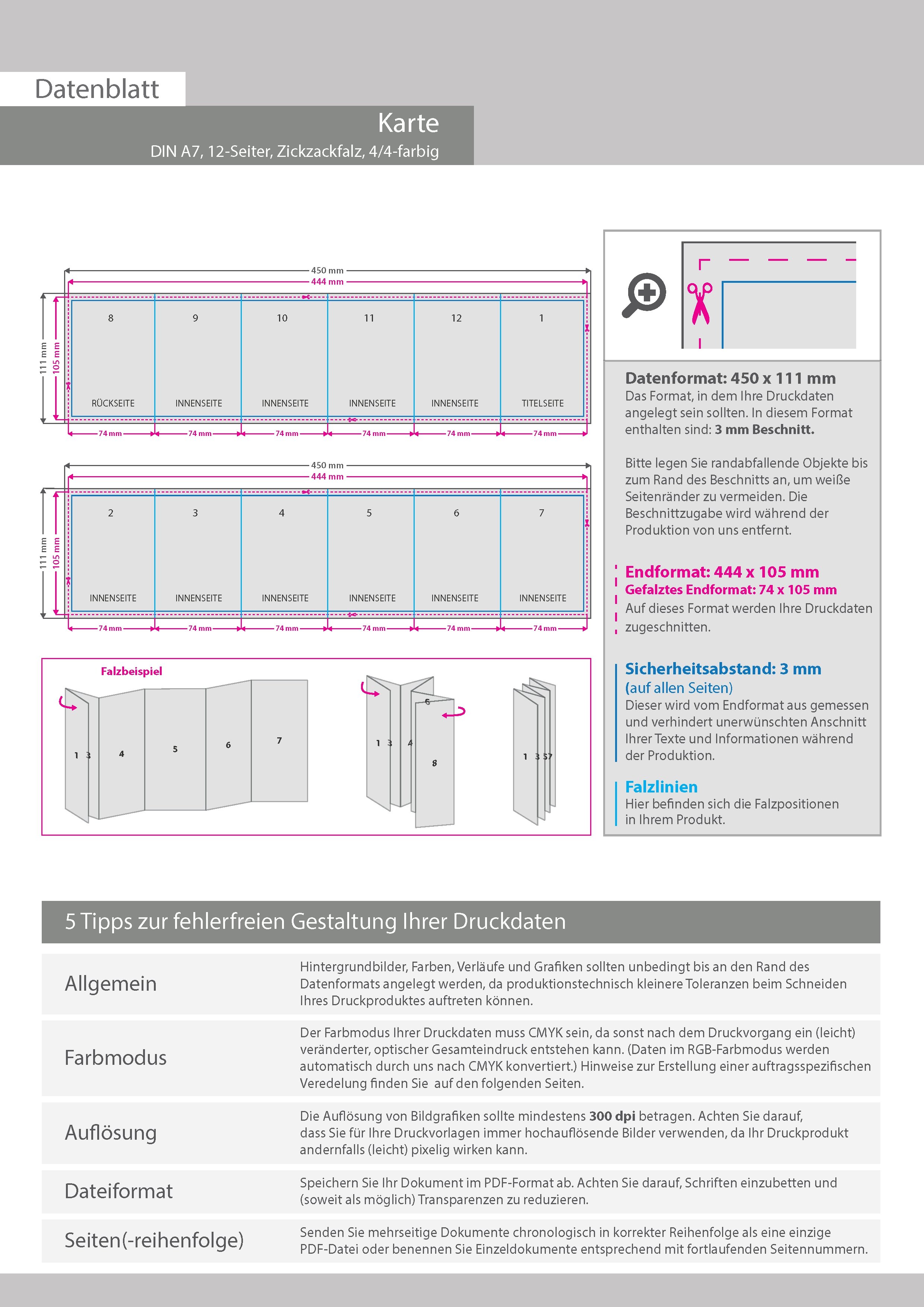 Einladungskarte, gefalzt auf DIN A7, vertikaler Zickzackfalz, 12-seitig