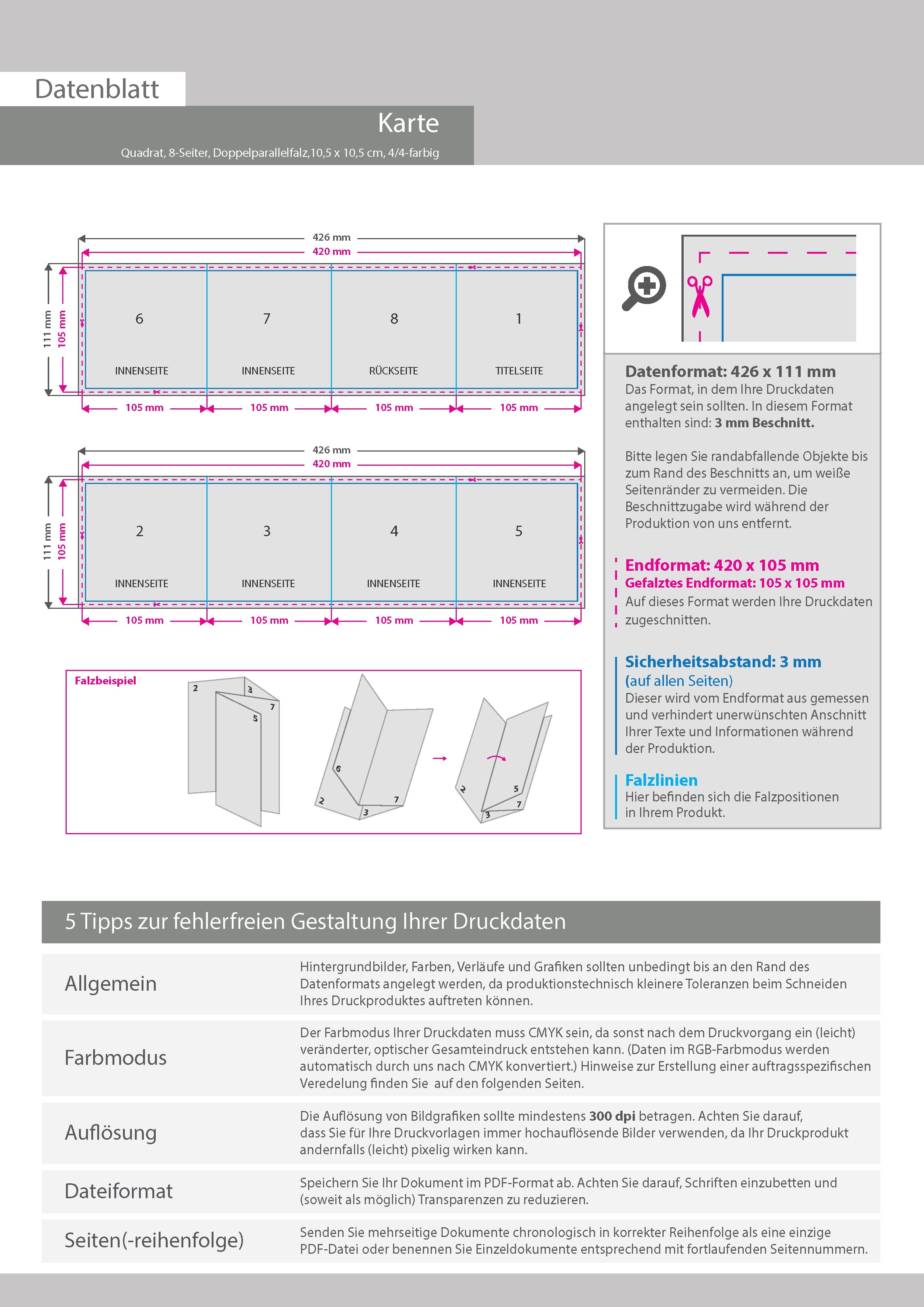Einladungskarte, gefalzt auf Quadrat 10,5 cm x 10,5 cm, vertikaler Doppelparallelfalz, 8-seitig